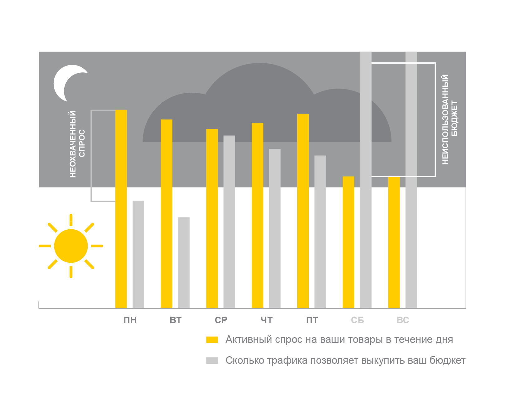 - в выходные может наблюдаться обратная картина, кампании тратят свой бюджет на день не полностью, теряя потенциальных клиентов по будням.
