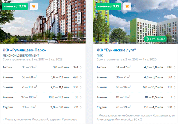 Точно такая же процедура действует и по выбору квартиры в новостройке. Вместо агентств недвижимости в качестве продавцов выступают застройщики. И в фильтре с правой стороны будут другие параметры: например, год сдачи дома, наименование застройщика и т. д.