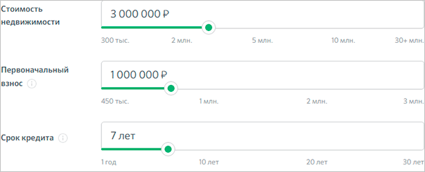 Основные параметры кредита (стоимость недвижимости, первоначальный взнос и срок кредита). Достаточно передвинуть ползунок на нужные цифры.