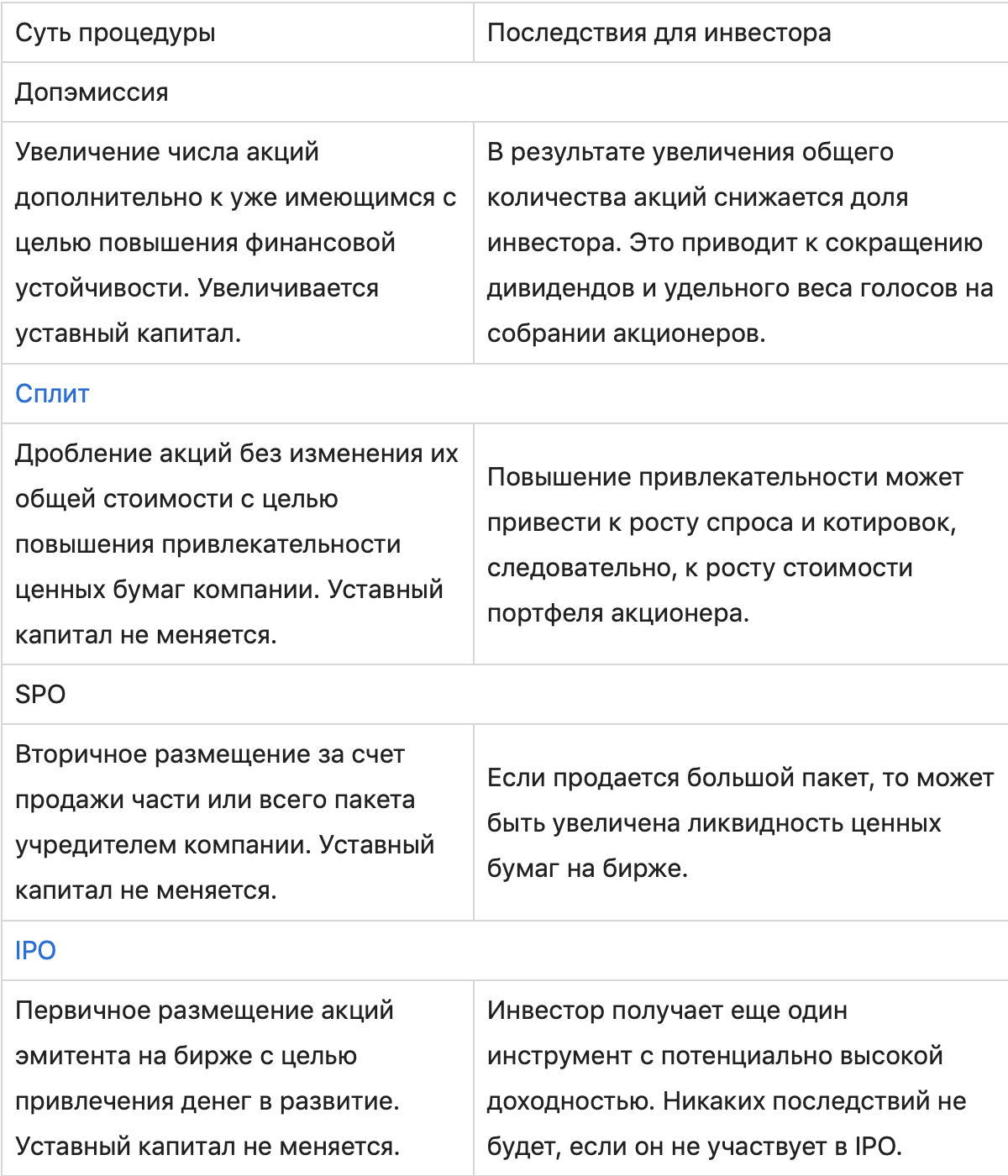 Чтобы понять особенности допэмиссии, необходимо рассмотреть процедуру в сравнении с другими на фондовом рынке: сплитом, SPO и IPO.