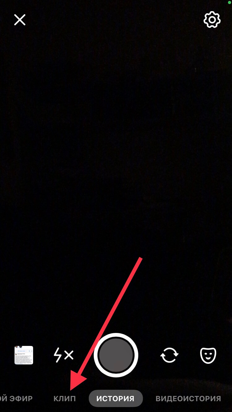Шаг 2. Когда вам откроется «История», проведите пальцем внизу экрана в правую сторону. Экран переключится на создание «Клипа».