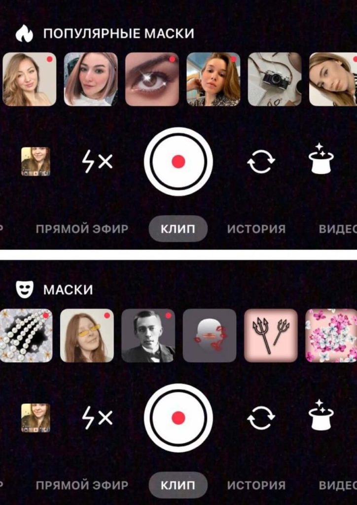 Чтобы использовать их, зайдите в клипы, откройте эффекты и перемотайте до одного из разделов масок. В начале, сразу после эффектов, — популярные маски, а в конце — все маски.