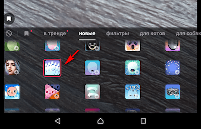 Где найти и как применить: эффект находится в трендах, применяется во время записи. Иконка выглядит как смайл с черными глазами.