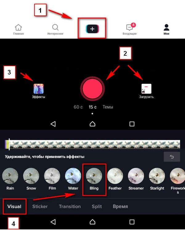 Шаг 1. Нажимаем на плюсик для добавления ролика. Записываем видео (красный кружок) или загружаем готовое из галереи. Переходим в раздел с эффектами, вкладка Visual.