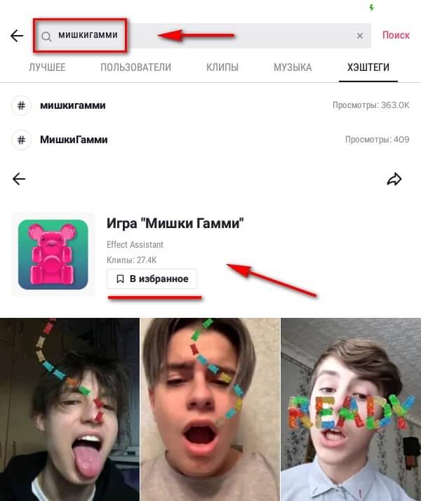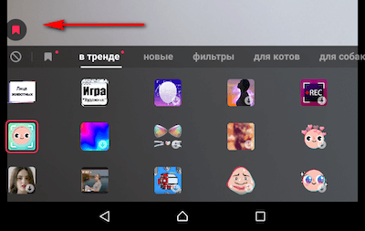 - Найти у другого пользователя и добавить к себе. Над описанием видео обычно отображается стикер, который использовался. Нажимаем на него, нас перебрасывает на страницу с эффектом, далее жмем «В избранное».