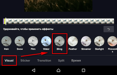 Записываем видео или загружаем готовое, переходим в раздел с эффектами, вкладка Visual – в ней прокручиваем эффекты вправо до названия Bling. Выбираем нужный отрезок и зажимаем кружочек с эффектом.