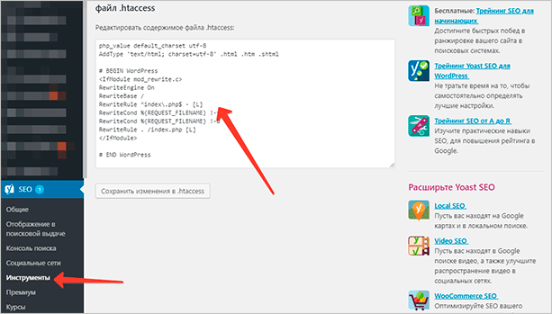 Но если вы хотите изменить этот файл на WordPress, то вам совсем не обязательно заходить на хостинг и открывать его там. Достаточно будет просто зайти в настройки плагина Yoast SEO, перейти во вкладку “Инструменты”. Содержимое конфига будет доступно прямо там, в специальном окне. Вы сможете легко его менять, и все изменения будут автоматически заноситься в настоящий конфиг.