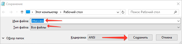 В поле “Имя файла” вводим “.htaccess”. В раскрывающемся меню “Тип файла” выбираем “Все файлы”. Далее, жмем на кнопку сохранить. Все, документ создан.