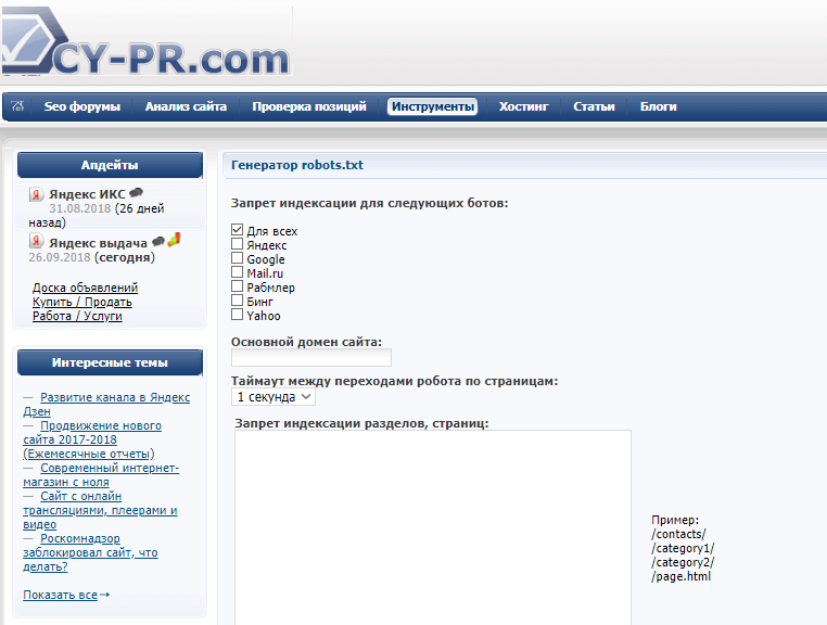 Вам просто нужно указать адрес своего сайта, для каких поисковых систем нужно задать правила, главное зеркало (с www или без). Дальше сервис всё сделает сам.