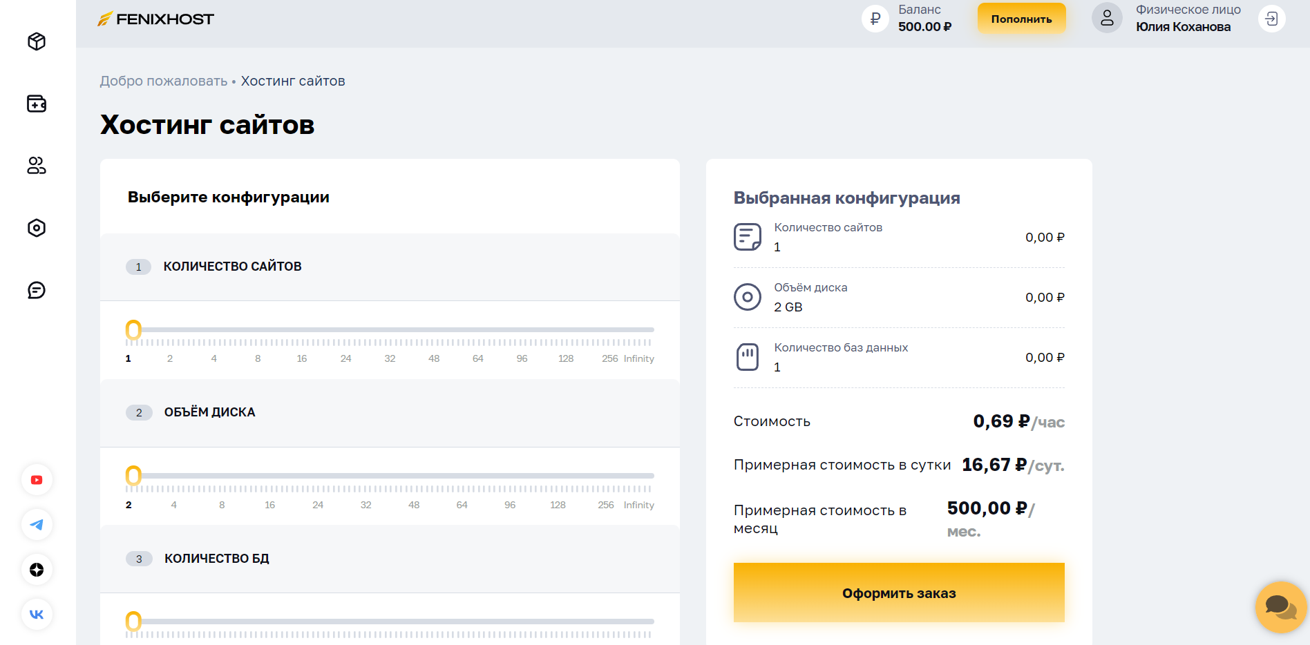 Одно из главных преимуществ Fenixhost — Вы платите именно за ту конфигурацию, которая Вам нужна, ни больше ни меньше. Собирается она очень легко: просто передвигаете ползунки в личном кабинете и готово.