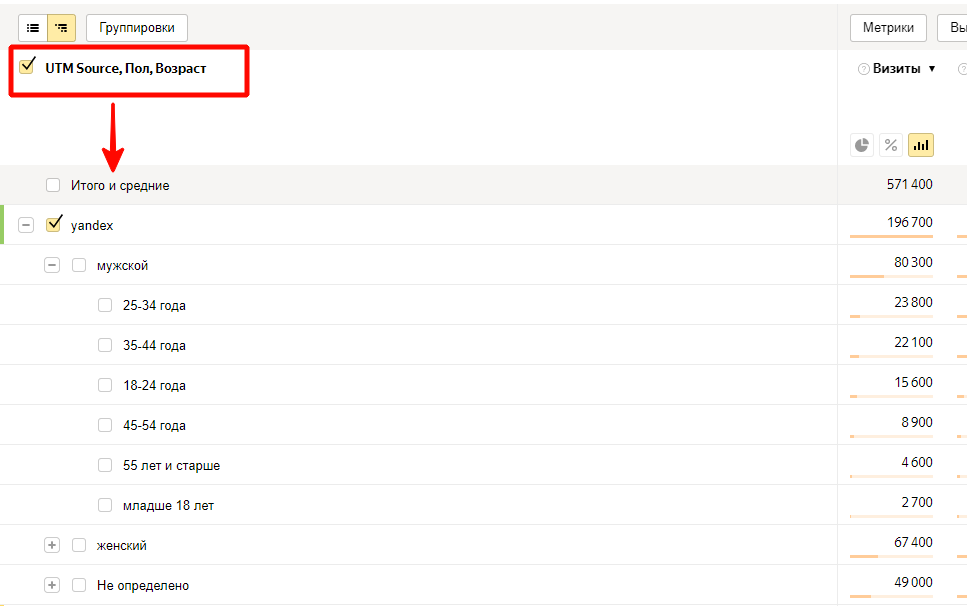 Статистику по меткам можно сочетать с другими параметрами, например с характеристиками аудитории. Для этого в «Группировках» нужно убрать ненужные параметры и добавить нужные.