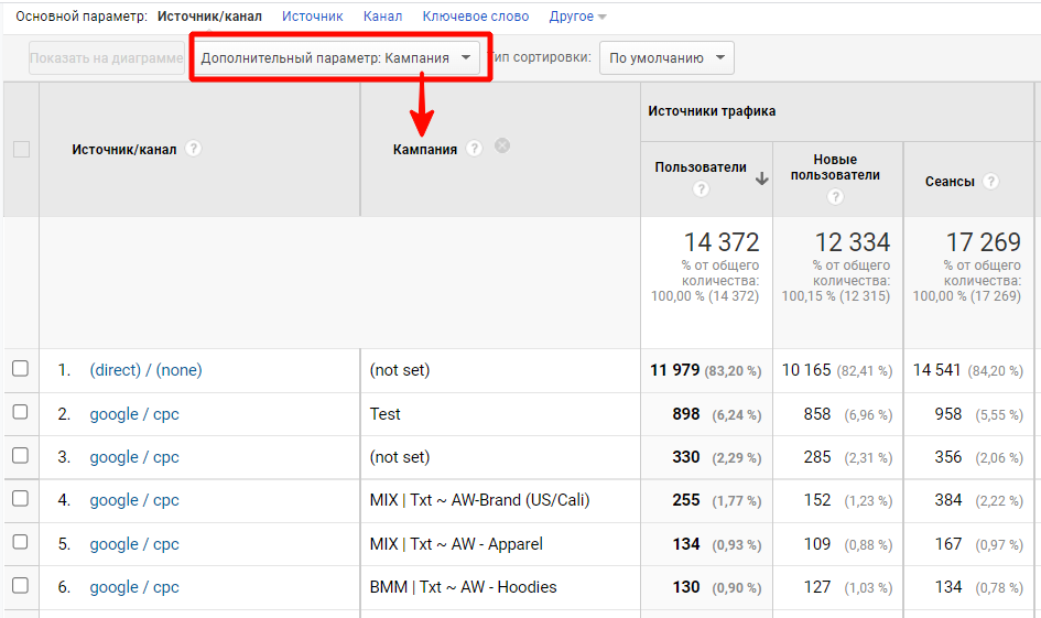 Здесь статистику можно посмотреть в отчете «Весь трафик» → «Источник/канал». По умолчанию в первом столбце видны разделенные слешем значения параметров utm_source и utm_medium.