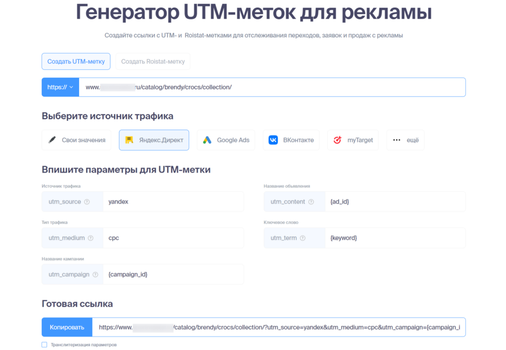 Как видите, источник и тип трафика добавлены статикой в зависимости от рекламной площадки, а прочие параметры – динамикой.
