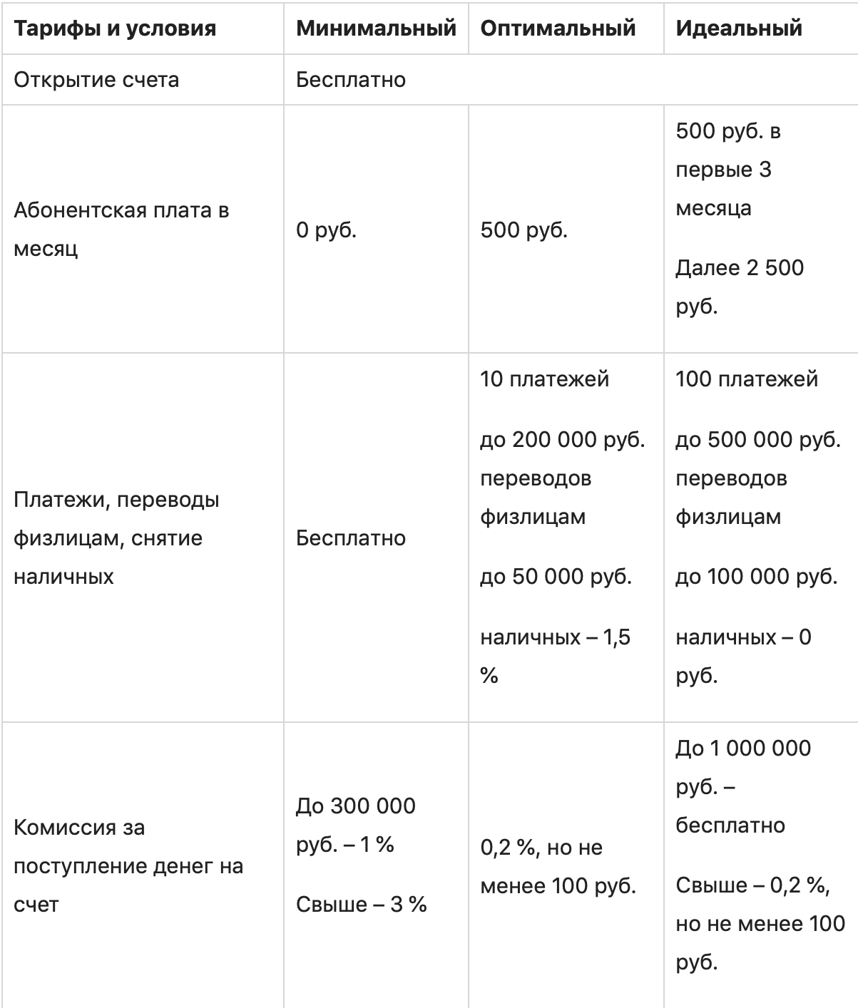 Предлагает 3 тарифа. Подробные условия представлены в таблице.
