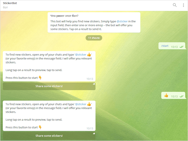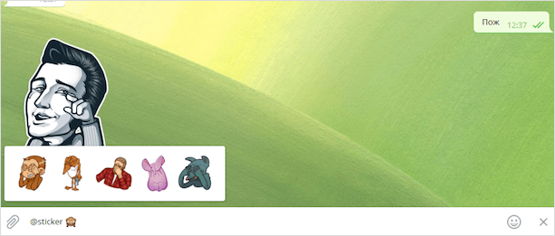 Бот поможет подобрать стикер, схожий по эмоции со смайликом. Добавляете бота @sticker (t-do.ru/sticker) себе по этой ссылке или находите в поиске самостоятельно. Выбираете смайлик, а бот предложит аналогичный стикер.