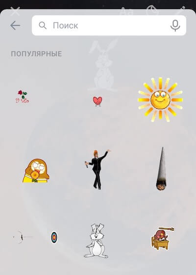 Шаг 2. Появится панель со стикерами. Выбираем стикер, на котором написано GIF.