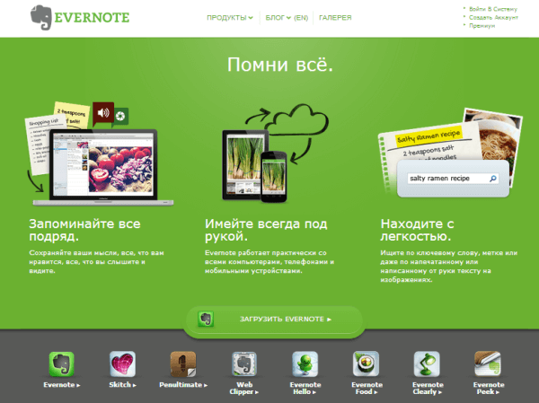 Хороший пример – страница Evernote. Тут очень хороший заголовок, но и перечисление выгод очень хорошо оформлено. Завершает это все четкий призыв к действию.