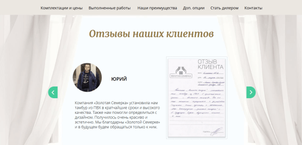 Очень хорошо работает размещение сканов благодарственных писем, на которых эти отзывы были размещены изначально. Это доказывает, что отзыв – подлинный, настоящий. Чтобы читать было удобнее, его можно набрать простым текстом (тем более, он будет индексироваться). Как здесь: