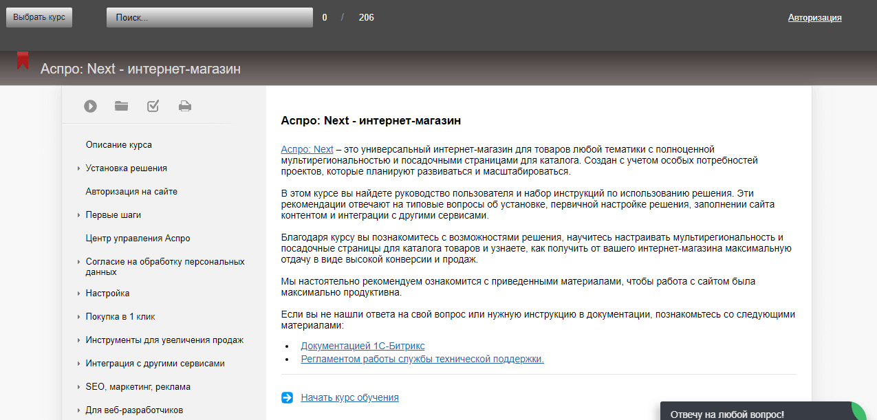 Это страница, главная цель которой – с помощью текста донести до читателя суть продукта или сайта. Пример – сайт движка интернет-магазина Аспро, точнее, курсов обучения работы с ним. Текст просто и понятно описывает, чем полезен данный сайт. Боковая навигация поможет выбрать подходящий курс. Со своей задачей – донести информацию до посетителя – страница справляется на отлично.