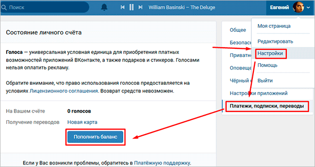 Пополнить баланс можно с помощью одноименной кнопки в разделе “Платежи, подписки, переводы” на странице настроек вашего профиля.