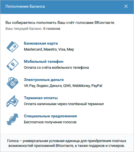 Для многих финансовых операций в ВК используются голоса – специальная внутренняя валюта, которой можно расплачиваться исключительно на “территории” социальной сети ВКонтакте.
