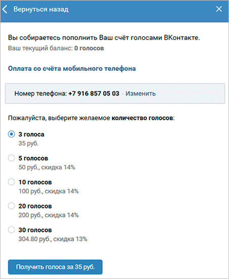 С помощью мобильного разрешается приобретать голоса только пакетами от 3 до 30 штук. Если возьмете больше трех сразу, то получите небольшую скидку, но даже с ее учетом цена будет колебаться в районе 10 – 12 рублей. Это почти в два раза дороже, чем при оплате той же банковской картой.