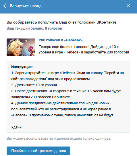 Оптимальным вариантом получения бесплатных голосов были и остаются специальные предложения. С их помощью можно с удовольствием и не напрягаясь пополнить свой баланс. Со сторонними сервисами заданий мы бы не стали связываться. Ведь кроме потери времени, можно еще и профиля в ВК лишиться.