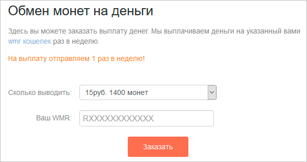 За лайк и подписку вы получите одну монету, за вступление в группу – две. Выглядит неплохо, пока не зайдешь на страницу вывода и не увидишь курс обмена местной валюты. Для получения 15 рублей необходимо отдать 1 400 монет.