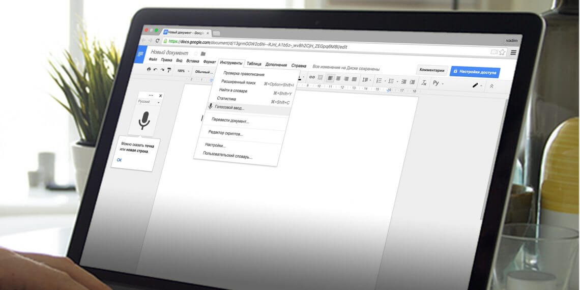 Чтобы воспользоваться набором, не прикасаясь к клавиатуре, вам нужно открыть вкладку “Инструменты”, а затем нажать на “Голосовой ввод…”
