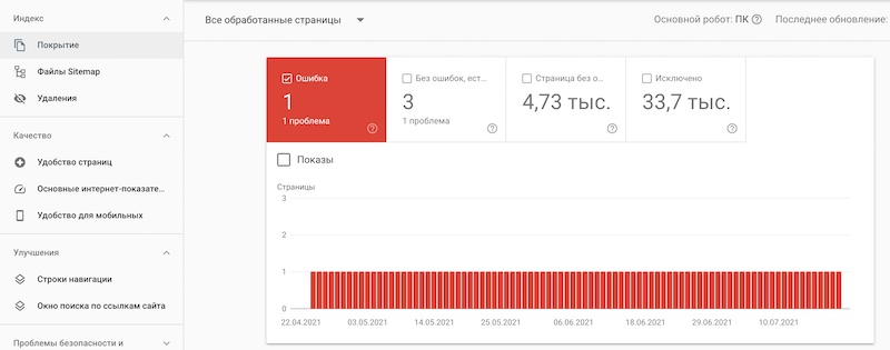 Покрытие сайта в поиске ГуглВ этом разделе можно узнать, какие страницы были проиндексированы Гуглом, а также какие разделы сайта были исключены из поиска. Сервис отображает данные в виде графика, а также предоставляет детальную сводку.