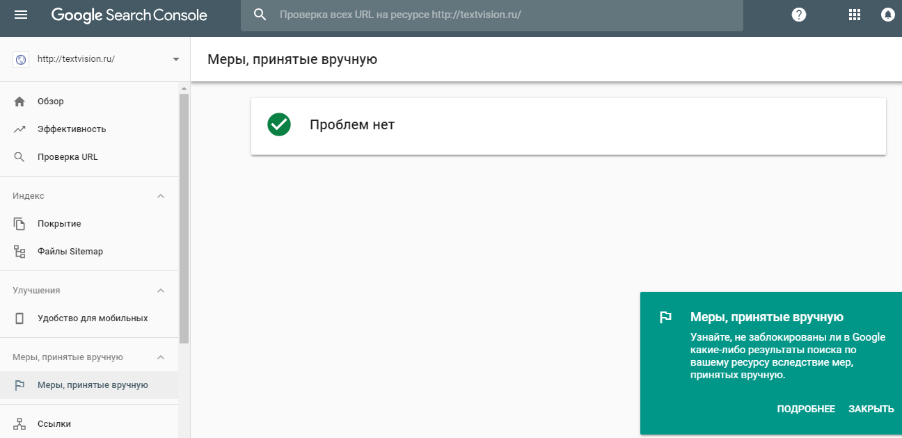 «Меры, принятые вручную»В этом разделе сервиса вебмастеры смогут ознакомиться со списком санкций, которые были наложены сотрудниками Google на продвигаемый сайт. Благодаря таким данным можно понять, почему те или иные разделы ресурса были исключены из поиска и как это исправить.