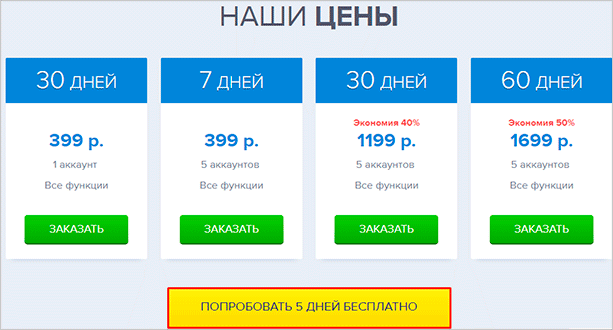 Если не превышать лимиты на комментарии, лайки и подписки, то можно успешно и планомерно продвигать сразу до 5 аккаунтов в Инстаграме по единому тарифу, затрачивая на это 1 – 3 часа в неделю. Чтобы оценить преимущества программы, вы можете в течение 5 дней использовать ее бесплатно.