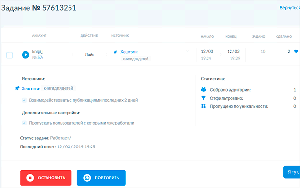 Пока выполняется масслайкинг, массфолловинг или другие процедуры, вы можете создавать следующую задачу, а потом вернуться на вкладку истории и проверить ход выполнения. Здесь будут храниться все операции, проработанные с помощью Instaplus. В любое время их можно повторить или удалить.