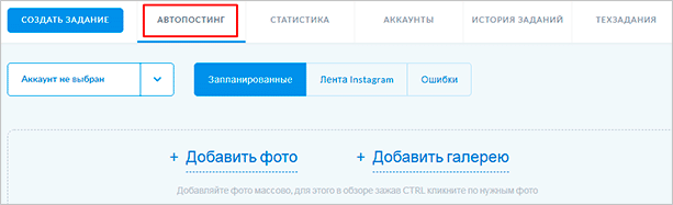 Выбираем аккаунт, затем нажимаем “Добавить фото”, чтобы создать публикацию с одним изображением или “Добавить галерею”, чтобы создать пост с каруселью.