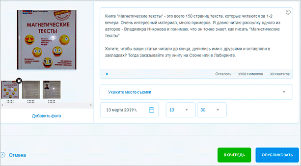 После подготовки нажимаем на кнопку “Опубликовать” или “В очередь”.