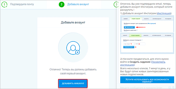 Теперь перейдите в почту и подтвердите свою регистрацию. После перехода по ссылке из письма вы попадете в личный кабинет. Программа сразу предлагает перейти к делу и добавить свой аккаунт в Инстаграме.