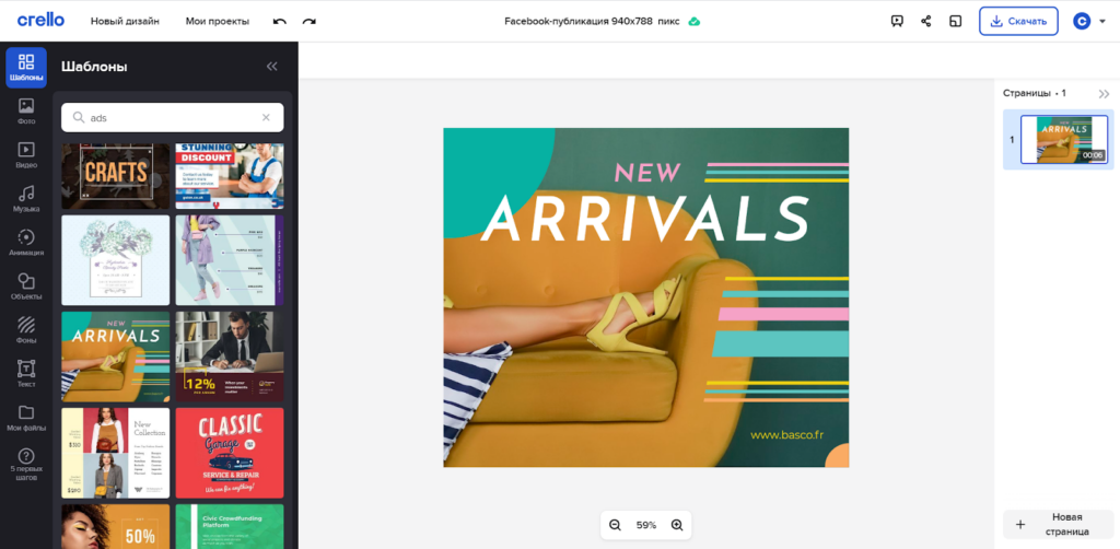 Crello — достойный конкурент Canva, онлайн-редактор графики и видео, где креатив для рекламы можно создать практически в пару кликов. Аналогично, помимо веб-версии, есть приложения для Android и iOS.