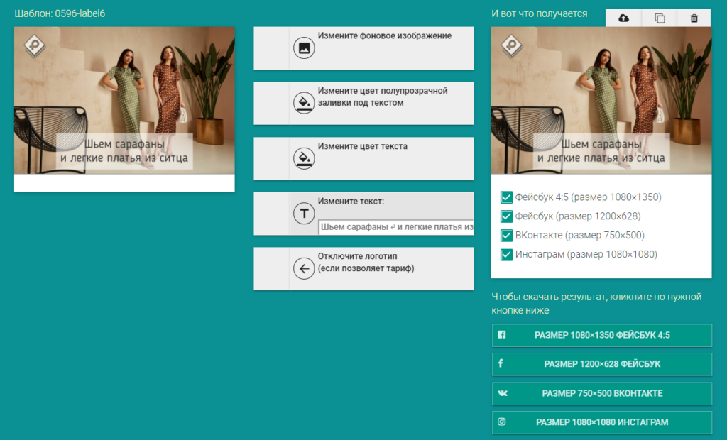 - можно загружать и использовать любые картинки и логотипы. Но экспортировать готовый креатив — только в PNG (еще можно сразу в соцсети).