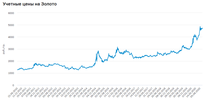 Драгоценные металлы не только защитный, но и долгосрочный инструмент. Не вариант покупать их на год или два. Выгодно инвестировать как минимум на 5 лет, а лучше – 20–40 лет. В долгосрочной перспективе актив растет. Посмотрите на график учетной цены на золото за последние 10 лет: цена с 1 275,2 руб. за грамм выросла до 4 715,5 руб. за грамм, т. е. в 3,7 раза или на 370 %.