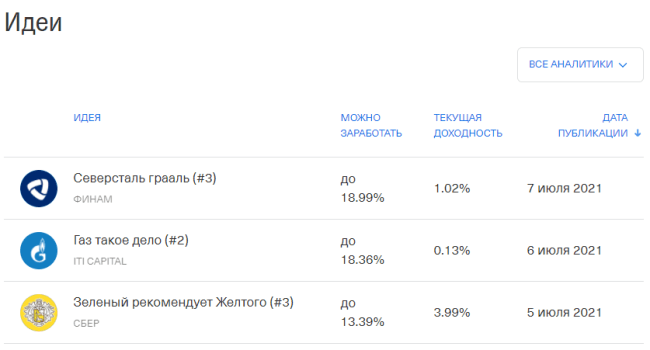На сайте Тинькофф выступает в роли агрегатора – публикует инвестидеи аналитиков разных брокерских и инвестиционных компаний. В карточке каждого варианта указывается краткое описание со ссылкой на оригинал, ожидаемую доходность и горизонт. Также по каждому эксперту дается точность прогнозов и процент прибыльных советов. Если вы являетесь клиентом брокера Тинькофф, то сразу же можно и реализовать идею. Список обновляется регулярно? по мере выхода рекомендаций у аналитиков.