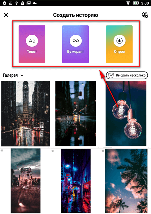*Текстовую сторис и фотоисторию можно создать и в приложении, и на компьютере. Также есть аудиоистории, но они доступны не во всех регионах.