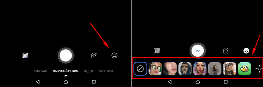 В режиме бумеранга и обычных видео можно включить фильтры с масками и снять с ними ролик. Это как маски и фильтры в Тик-Токе. Чтобы вызвать панель, нужно кликнуть на значок смайла.