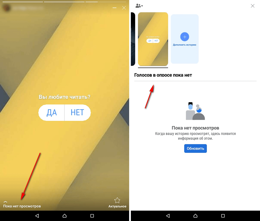 Как посмотреть результат опроса: открываем сторис. В нижнем левом углу будет указано количество просмотров. Если нажать на этот пункт, откроется панель с просмотрами и голосами. Они появятся после того, как первые люди примут участие в опросе.