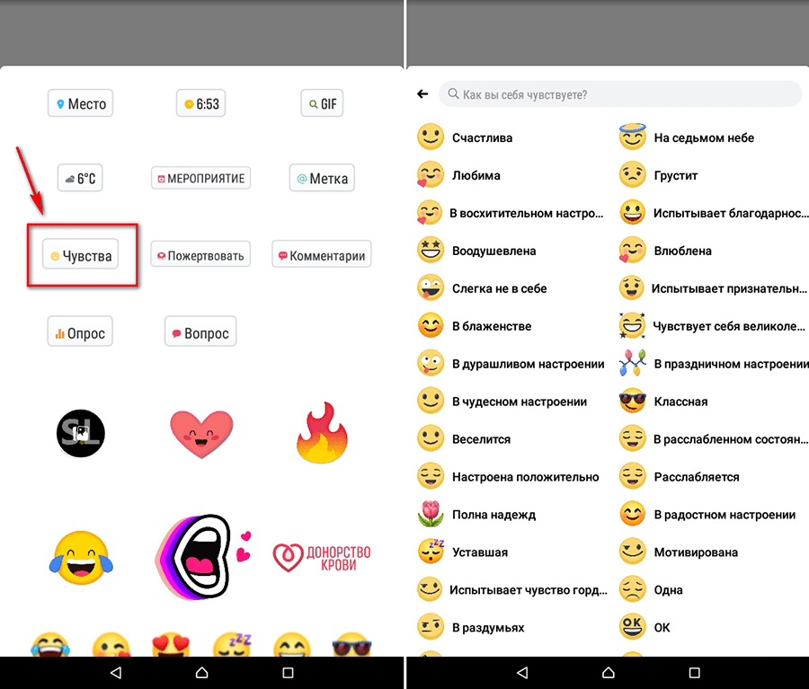— Чувства. Возможно, вы уже замечали, что к постам на Фейсбуке можно добавить настроение и даже указать другого человека, например, «Влюблена в Peter». То же самое можно сделать в сторис, но в виде стикера. Правда добавить человека к своему чувству тут нельзя. Жмем на наклейку «Чувства» и выбираем из предложенных вариантов. Их несколько десятков.