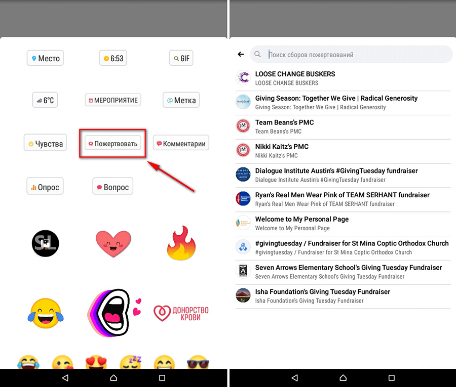 — Пожертвовать. Добавляет стикер благотворительной организации. Организацию можно выбрать из предложенного Фейсбуком списка.