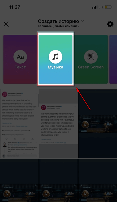 Если в вашем регионе доступны музыкальные сторис, в верхней панели с типами историй будет прямоугольник со словом «Музыка». Кликаем на него.