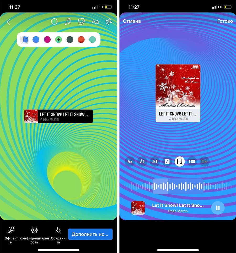 В музыкальных сторис также можно менять фон, добавлять текст, стикеры и рисовать кистью.