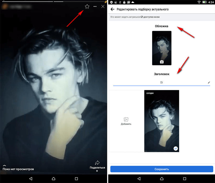 В Фейсбук тоже есть актуальное. Функция позволяет сохранять сторис более, чем на 24 часа. Чтобы добавить туда опубликованную историю, нужно сначала ее открыть, затем нажать на значок со звездочкой. Откроется меню, где нужно выбрать обложку и написать название истории.