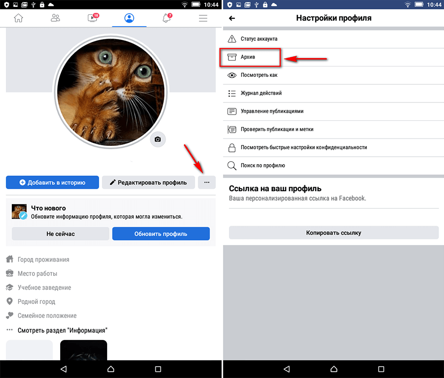 Чтобы найти архив нужно зайти в свой профиль, нажать «Еще» или 3 точки под фото обложки. В настройках профиля выбираем архив историй.