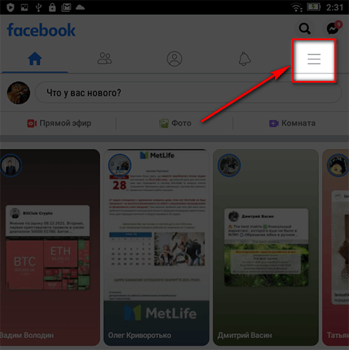 Способ #2. Перейти в меню приложения Facebook (3 горизонтальных полоски в правом верхнем углу).